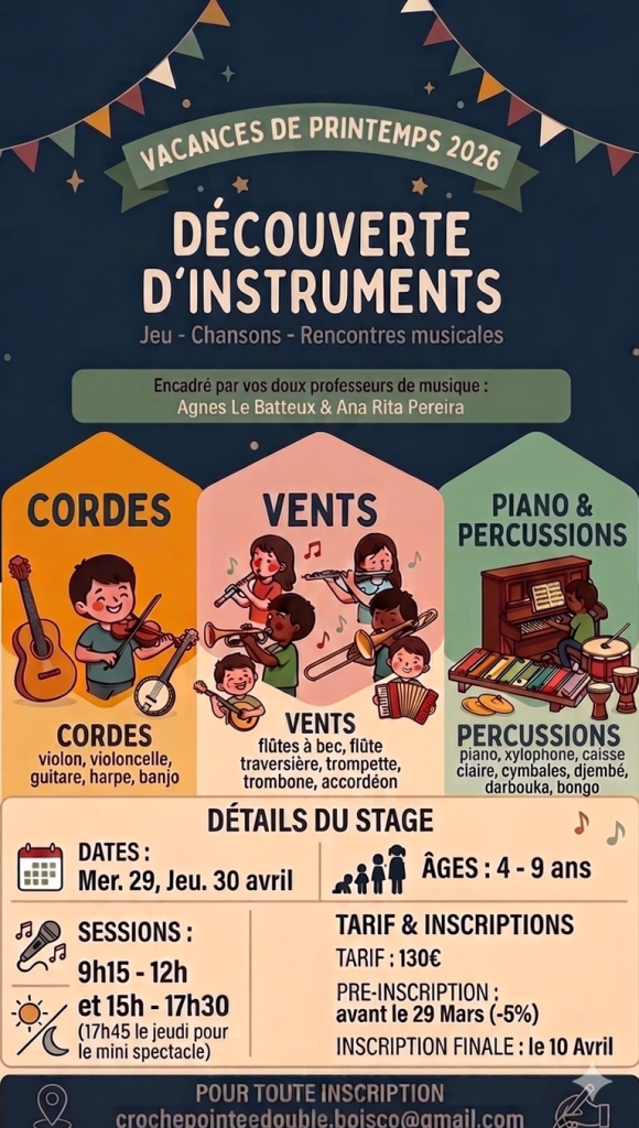 L’association Croche Pointée Double serions vraiment ravis d’accueillir vos enfants pour partager deux journées musicales, joyeuses et pleines de découvertes.