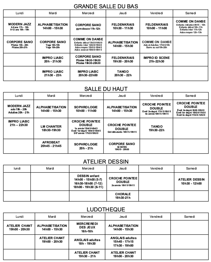 PLANNING DES ACTIVITÉS HEBDOMADAIRES